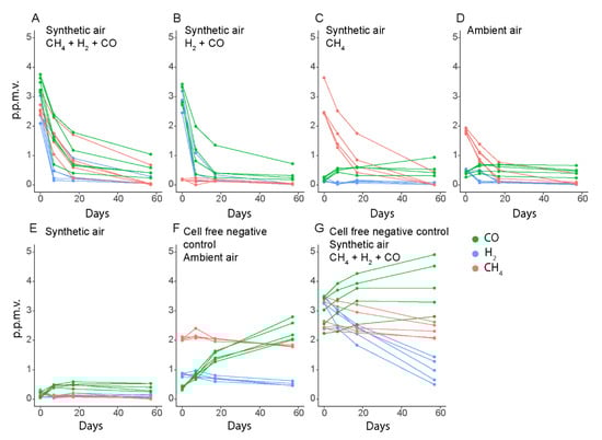 Oxidation of CH4, CO, and H2 by M. gorgona MG08. (A–E) contained polycarbonate filters with M. gorgona MG08 floating on nitrate mineral salts medium. (F,G) contained sterile filters. The lower H2 concentrations at the start of the ambient air incubations with cells (D) compared to those without cells (F) are due to leaving prepared bottles overnight before measuring the first time point T0, allowing some oxidation to already occur. All gases used were of the highest commercially available quality, 6.0 (99.9999% purity). The multiple data points in each color represent different biological replicates from the same condition. Synthetic air contained less than 0.2 p.p.m.v. of CH4, CO and H2.