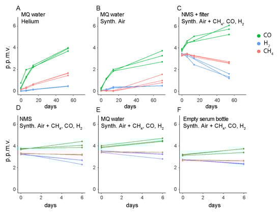 The control experiment to determine gas leakages (18 bottles) included six different types of liquids and headspace compositions: (A) 50 mL MilliQ water and 200 mL headspace of pure helium. (B) Sterile floating polycarbonate filter on 50 mL of 1/10 diluted NMS medium without EDTA and 200 mL headspace with 2–5 p.p.m.v. CH4, H2, CO in synthetic air. (C) 50 mL of milliQ water and synthetic air. (D) 50 mL of 1/10 diluted NMS medium without EDTA and 2–5 p.p.m.v. CH4, H2, CO in synthetic air. (E) 50 mL of milliQ water and 2–5 p.p.m.v. CH4, H2, CO in synthetic air. (F) Empty glass bottle with 250 mL of 2–5 p.p.m.v. CH4, H2, CO in synthetic air.