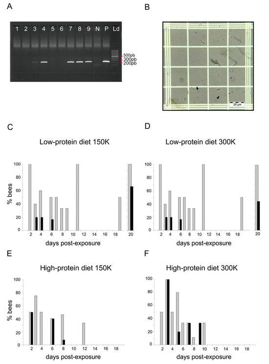 Parasite loads. (A) Example of agarose electrophoresis gel with negative (lanes 1, 2, 5, and 6) and positive (lanes 3, 4, 7–9) bumblebees to N. ceranae determined by PCR. N: negative control of PCR; P: positive control of PCR; Ld: molecular size marker (100 pb). (B) Example of N. ceranae spores observed in an infected bumblebee (optical microscope, ×400). (C–F) Proportion of dead bumblebees at different days postexposure that were PCR-positive to N. ceranae (grey bars) and showed spores in their gut (black bars) for both diets (high- and low-protein diets) and spore dosages (150 K and 300 K). Each group contained between 44 and 47 individuals.