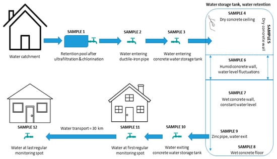 Sampling spots throughout water distribution system and inside concrete water storage tanks. Water samples are indicated as Sample-1, to -3, and Sample-10 to -12. Thick blue arrows indicate water flow. Samples inside the two concrete tanks that were taken by swabbing the surface are indicated as Sample-4 to -9. Thin blue arrows indicate water level as fluctuating or permanent.