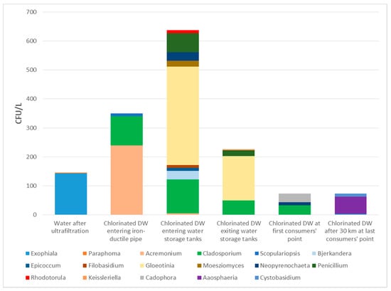 Fungi were isolated from all water samples (Table 1). The most frequently isolated genus was Cladosporium, detected in four out of eight sampling locations (50%). One-third of the samples were positive for filamentous fungi of the genera Acremonium, Exophiala, Gloeotinia, Neopyrenochaeta, and Penicillium, while yeasts were detected only sporadically. Some fungi were not detected throughout the water preparation process. For instance, water from the retention pool yielded after ultrafiltration 146 CFU/L, 143 of them were identified as Exophiala cancerae. Nevertheless, this species was completely absent at later stages that followed water chlorination. The number of fungi in chlorinated drinking water was the highest before entering the main pipe system toward water storage tanks and at the immediate entrance to water storage tanks (both uncountable; > 330 CFU/L). The most common fungus in water before entering the pipe system was Acremonium sclerotigenum (160 CFU/L), while Gloeotinia sp. dominated in samples just before entering the water storage tanks (> 330 CFU/L) and at the exit point of the tanks (153 out of 226 CFU/L). Numbers lowered with the distance and time of water transportation. For instance, species of Cladosporium and Penicillium were present in water entering and exiting the storage tanks, while only Cladosporium was detected also at the first consumers’ tap sampling point. The lowest number of fungi was detected in the samples at the first and the last regular monitoring spot at consumers’ taps (both 73 CFU/L). Cadophora malorum was with 30 CFU/L the most common fungus at the first consumers’ tap collection point, and Aaosphaeria arxii (60 CFU/L) was the most common species after 30 km of water flow at the last consumers’ tap collection point (Table 1 and Figure 2).