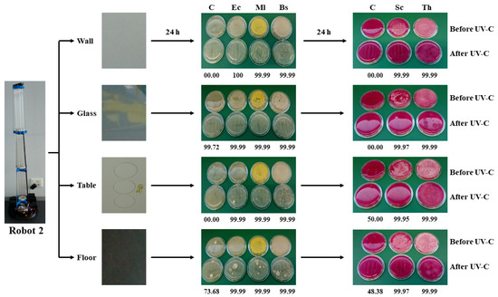 Scheme of representative surfaces showing the robot 2 apparatus and area of sampling. Percentage of reduction survival values based on bacterial and fungal cfu counts after 48 h incubation of Rodac-PCA, and Rodac-RBC plates, respectively, are depicted. As for robot 1, to calculate the log10 reduction, starting microbial values ranging from 1.6 × 104 cfu mL−1 (S. cerevisiae) to 1.65 × 109 cfu mL−1 (E. coli), as well as median values obtained after irradiation processes were used. As a log10 value of 3 was given to plates when cfu overlapped, a high percentage of reduction could be determined where no reduction in counts seemed to be visually appreciated when comparing before and after plates, that is due to the impossibility of cfu counting and the arbitrary number given to those plates for analytical purposes. Acronyms refer to Control (C), E. coli (Ec), M. luteus (Ml), B. subtilis (Bs), S. cerevisiae (Sc) and, T. harzianum (Th).