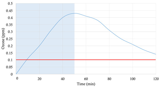 Ozone generated (ppm) by robot 2 (450 W, UV-C185–254-nm) with indications for functioning starting time (0 min), and robot switching off (50 min), depicted by a shadowed area, and measurement ending (120 min). In red is the US- Occupational Safety and Health Administration (OSHA) Threshold Limit Value (0.1 ppm).