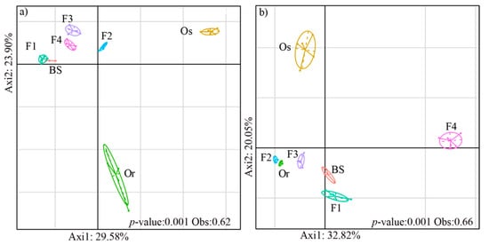 Between-class analysis (BCA) of (a) bacterial and (b) fungal communities in bulk soil (BS) and the rhizospheres of the female parent Oryza rufipogon (Or) wild rice; male parent Oryza sativa (Os) cultivated rice; hybrid generation (F1); and the generations F2, F3 and F4 obtained by self-crossing. Each rice generation is represented by a circle, the size of each circle represents the 95% confidence interval.