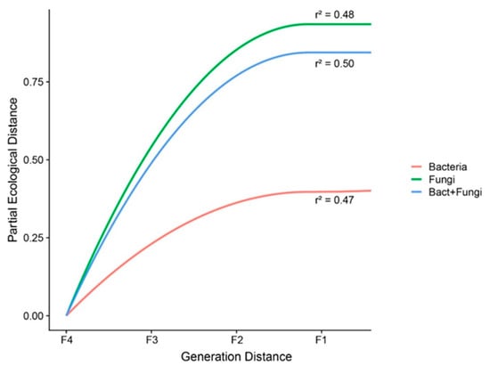 To explore the effects of self-crossing in the bacterial and fungal communities, we evaluated the changes in the dissimilarity of the communities (bacteria and fungi) along rice generations via GDM. The results revealed that rice self-crossing reduced the microbial community dissimilarity, but the magnitude of the decrease differed for bacteria and fungi. The fungal community dissimilarity showed a higher sensitivity to self-crossing than the bacterial community and total community (bacteria + fungi) (maximum partial ecological distances of 0.94, 0.44 and 0.84 for the fungal, bacterial and total communities, respectively; see Figure 5). In summary, the greater the number of self-crossings, the smaller the dissimilarity within the bacterial and fungal communities in the rice rhizosphere.