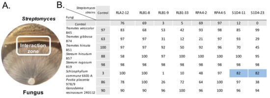 Co-cultures were described with various bacteria and fungi [23]. Regarding fungi, wood-decaying fungi have already been used [25,26] and are of special interest as they are known to control and to modify bacterial communities in their environment [27,28], in particular through metabolites production and pH modification [29]. They thus constitute good candidates to produce antibacterial compounds or to trigger such production in interaction.