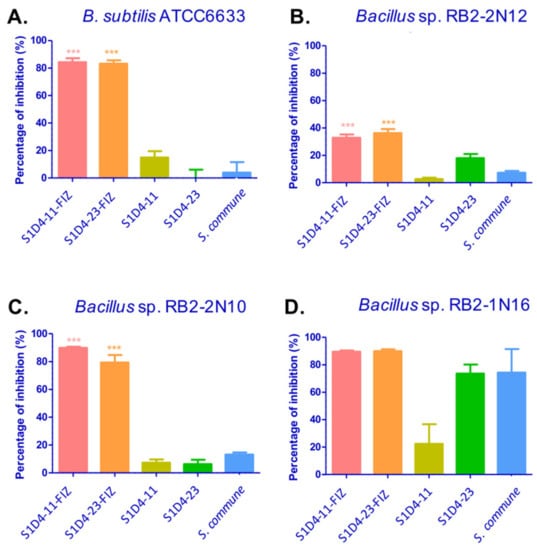 Antimicrobial activities of S1D4-11-FIZ and S1D4-23-FIZ against different Bacilli. Inhibition was quantified as a percentage of growth inhibition in comparison with a control without extract. The growth was measured by spectrometry at OD 600 nm after 24 h of growth. The different Bacilli strains are (A) Bacillus subtilis ATCC6633, (B) Bacillus sp. RB2-2 N12, (C) Bacillus sp. RB2-2 N10, and (D) Bacillus sp. RB2-1 N16. Statistical difference was assessed with a t-test. *** = p value < 0.005 for both comparisons between fungus and Streptomyces-fungus interaction zone (SFIZ) and Streptomyces and SFIZ.