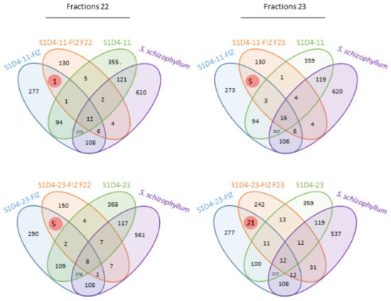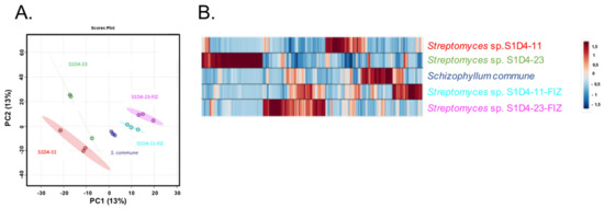 In order to decipher the metabolic impact of co-culture, molecular profilings of the two selected SFIZs as well as the corresponding pure culture extracts were analyzed by gas chromatography coupled to a mass spectrometer (GC-MS). GC-MS was already used for the characterization of bioactive Streptomyces strains [52] and the used derivatization enabled us to detect more compounds, such as amino acids and lipids. Based on ions extracted from mass spectra, 2796 features were detected with MzMine 2 software and partial least square-discriminant analysis (PLS-DA) showed that each extract (controls and SFIZs) can be discriminated from the others (Figure 3A). From the PLS-DA, discriminating variables (26%) were compared in a heatmap (Figure 3B) and only showed slight overlap, giving a unique bar code for each condition. These results show that mono-culture extracts are different and that each microbe has a specific metabolomic signature. Secondly, the extracts from the co-cultures differed from their controls, indicating that a specific production of compounds was induced during the interaction. To confirm these results with more polar and soluble compounds [53], SFIZ and control extracts were analyzed by ultra-high-performance liquid chromatography with tandem mass spectrometry (LC-MS/MS). In the co-culture experiment between S1D4-11 and S. schizophyllum, 387 features were specific to the fungus extract (i.e., not found in other extracts) and 163 to the bacterial extract (Figure 4). In the co-culture between S1D4-23 and S. schizophyllum, 340 features were specific to the fungus extract and 131 to the bacterial extract. Regarding the SFIZs of these two co-cultures, 458 and 473 features were respectively identified, with around a quarter being shared with either the fungal or the bacterial controls, logically reflecting that they are produced during both mono- and co-cultures. Interestingly, a greater proportion of these SFIZ features were specific (225 for S1D4-11-FIZ and 202 for S1D4-23-FIZ) and confirmed that co-cultures greatly affect the metabolome. Moreover, almost half of these SFIZ specific features (n = 108) were shared between S1D4-11-FIZ and S1D4-23-FIZ, suggesting that a significant part of the specific metabolic response induced by the interaction is common between the two co-cultures. We can speculate that most of these shared compounds are produced by S. commune, which is common to both co-cultures, and/or by a common metabolism induced in Streptomyces in response to the fungus.