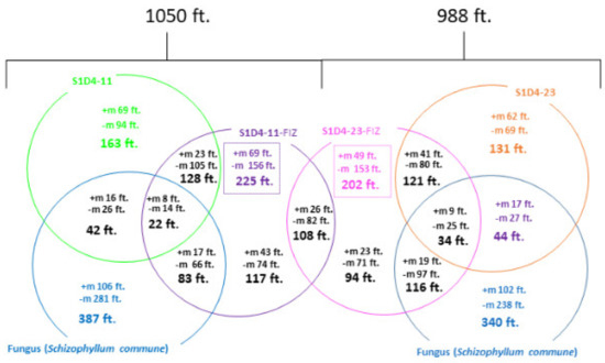 The two selected couples were both composed of the fungus S. commune 66-01A with Streptomyces S1D4-11 or S1D4-23. S. commune is a wood-decaying fungus that can induce melanin, indole, flavonoids, and carotenoids when grown in the presence of co-occurring bacteria or fungi [50]. It also represents a good interaction model with Streptomyces, as it was shown to restore hyphal formation-deficient phenotypes in some strains [51]. S1D4-11 and S1D4-23 are closely related but different species of Streptomyces and each were previously predicted to harbor 36 BGCs with 25 in common and 11 specific ones [8]. It can be noticed that the two other Streptomyces RLB1-33 and RLB1-9 that showed no anti-B. subtilis activity in mono-culture (Figure 1B) had no induced capacity in their SFI zones with S. commune. This result highlights that whether the elicited activity came from the fungus or the bacteria, it was specific between S. commune and the strains S1D4-11 and S1D4-23.