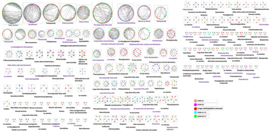 To identify the chemical actors of these specific metabolic responses, a LC-MS molecular networking with GNPS (Global Natural Products Social Molecular Networking) that gathers MS/MS spectra into networks corresponding to chemical families was performed. In total, 187 networks were detected with 159 identified as chemical families (Figure 5). The non-identified molecule families (labeled “no matches”) could correspond to new molecules, and half of SFIZ compounds (nodes within networks) were present in this category. It might suggest that the co-cultures induced a less characterized metabolism than single cultures that can be the source of innovative molecules. Four networks were found to be specific to one or both SFIZs. Among them, S1D4-11-FIZ presented specific oligosaccharides, S1D4-23-FIZ presented phytoceramides and vinyl bromides, and both SFIZs had specific alkaloids and derivative compounds that can have pharmaceutical properties, including antibacterial activities [54].