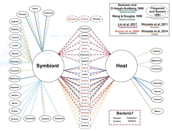 - Wang, J.T.; Douglas, A.E. Essential amino acid synthesis and nitrogen recycling in an alga-invertebrate symbiosis. Mar. Biol. 1999, 135, 219–222. [Google Scholar] [CrossRef]