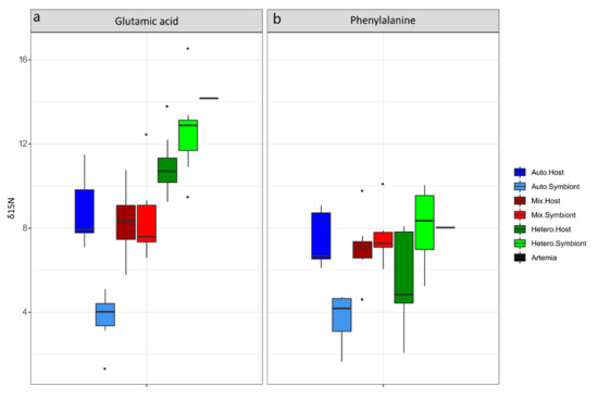 Contrary to the symbionts, the mixotrophic host presented a smaller change in the δ15N value of glutamic acid with heterotrophy. This might suggest that this compartment does not keep a large proportion of this AA for its own use, and rather transfers it to the symbionts. The process here could be similar to that observed in the pea aphids-Buchnera symbiosis, in which aphids specifically exchange glutamic acid with Buchnera symbionts for other essential and nonessential amino acids [61,62]. In the heterotrophic treatment, however, the host exhibited a noticeable increase in its trophic index, suggesting that food is directly assimilated both in the host and the symbionts in such a situation. The observed increase indicates that the holobiont is not fully heterotrophic, since if this was the case, one would expect it to be more enriched than its Artemia food source. However, this is partially also due to the varying tissue turnover rates within the host and symbiont compared to our experiment length. Tissue turnover rates differ between compartments and amongst species, as well as between carbon and nitrogen pools, and have been shown to take hundreds of days for complete turnover [52,63]. Nevertheless, the increased δ15N-values of the coral holobiont between autotrophy and heterotrophy suggests that the coral holobiont is indeed reliant mostly on organic nitrogen.