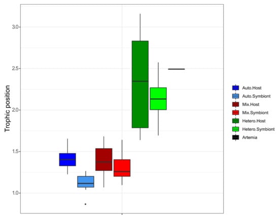 The trophic index (TP) ratio (Figure 3) was different among nutritional treatments (Kruskal–Wallis rank sum test p < 0.001) but not between symbionts and host tissue. There was also no significant difference between the auto and mixotrophic groups (TP ratio between 1.13 and 1.40 ± 0.22). However, we did observe a significant increase in the TP ratio of the heterotrophic group, which was significantly different from the other groups (post-hoc Wilcoxon rank sum test, p < 0.007).