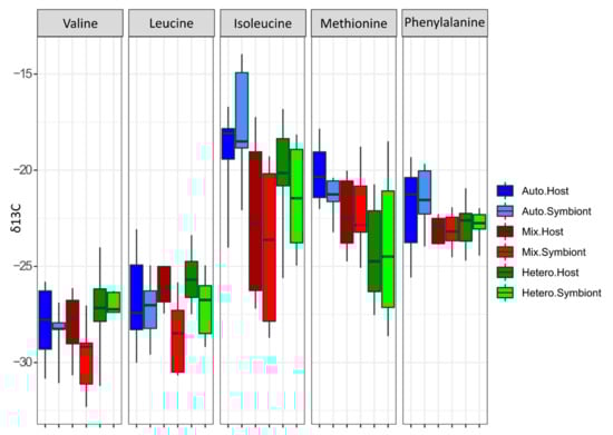 Changes in the δ13C value of the essential amino acids according to the nutritional state of the coral holobiont: the autotrophic host and symbionts are represented in blue, the mixotrophic host and symbionts in red and the heterotrophic host and symbionts in green.