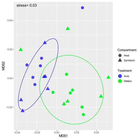 For δ13C-AA data analysis: δ13C data were normally distributed and were checked as described above. To test for differences between two treatments (autotrophy vs. heterotrophy), we used a non metric multidimensional scaling (nMDS) following a permutational multivariate analysis of variance (PERMANOVA) with distance matrices test [41] implemented as Adonis in the Vegan package. In Adonis, Euclidean distance matrix measurements were used as a response variable, considering the additive effect of the treatment (auto and hetero) and compartment (host and symbiont) factors [42].