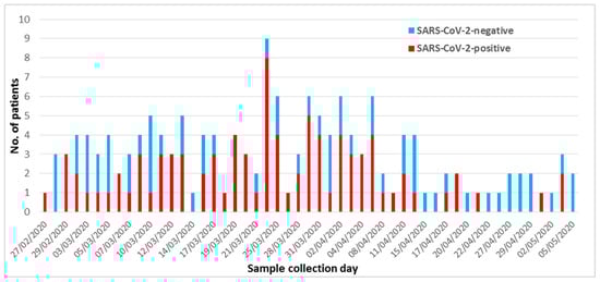 In Italy, the first case of SARS-CoV-2 infection was assessed on 7 February 2020 in a non-Italian subject recently coming from China, but the infection has become epidemic since 21 February 2020, when autochthonous cases were identified in Northern Italy []. In the area of Parma, where our laboratory is located, the first case was reported from a suckling baby whose sample was sent to the laboratory on 25 February 2020 [], and SARS-CoV-2 became epidemic on 3 March 2020, with a total of 3298 cases and 710 deaths recorded until 10 May 2020 [].