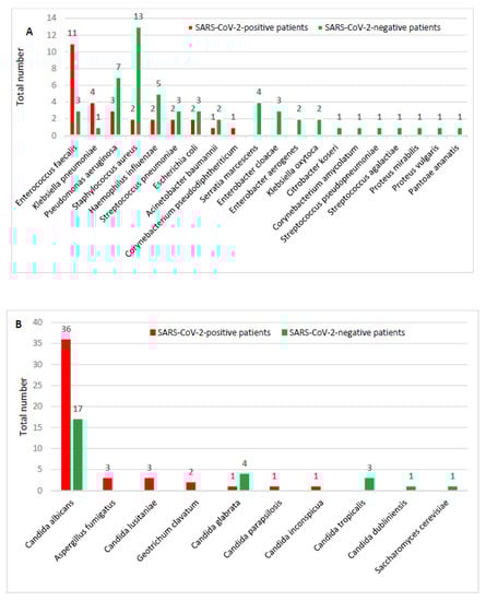 In particular, among the SARS-CoV-2-positive patients, a total of 75 agents other than SARS-CoV-2 were found: 28 bacteria (Figure 2A) and 47 fungi (Figure 2B). Enterococcus faecalis (11) and Klebsiella pneumoniae (4) were the most frequently isolated bacteria, while Candida albicans (36) was the most frequently isolated agent among yeasts. Among the SARS-CoV-2-negative patients, a total of 55 bacteria (Figure 2A) and 26 fungi were found (Figure 2B). Staphylococcus aureus (13) and Pseudomonas aeuginosa (7) were the most frequently isolated bacteria, while Candida albicans (17) and Candida glabrata (4) represented the most frequently isolated fungi. The detailed list of the different agents found for each sample of each SARS-CoV-2-positive and SARS-CoV-2-negative patient is reported in Supplementary Tables S1 and S2, respectively.