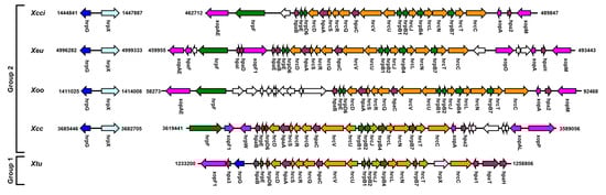 Flagellar and injectisome type 3 secretion systems are abundant among Xanthomonas species [3]. The flagellar T3SS (FT3SS) is required for motility, biofilm formation, and chemotactic movement [15,16,17]. Disruption of the FT3SS affects entry and infectivity of the bacteria and is mostly associated with the epiphytic stage of Xanthomonas life cycle [1,17]. Injectisome type 3 secretion system (T3SS) enables the translocation of effector proteins from bacteria to eukaryotic cells which affect host signaling and metabolism [18]. Many bacteria utilize this system to establish pathogenic or symbiotic interactions with their eukaryotic hosts. A hypersensitive reaction and pathogenicity 2 (hrp2) family injectisome T3SS [19,20] is found in the majority of pathogenic Xanthomonas strains and is considered as one of the main pathogenicity factors of the bacteria [3,21]. Almost all pathogenic group 2 Xanthomonas species harbor T3SS genes that are localized in a ~30 kb chromosomal pathogenicity island and composed of approximately 20 core structural component coding genes in six transcriptional units (A to F), while additional T3SS accessory and effector coding genes within the pathogenicity island vary between species or pathotypes [22] (Figure 1). Disruption of any key structural component of the T3SS results in the inability to cause disease, colonize host plant, and induce hypersensitive response (HR) in resistant host varieties [3]. In addition, hrp-dependent pathogenic Xanthomonas strains encode on average 25–35 T3SS effectors (T3Es) that were reported to function in manipulating host immune signaling, liquid accumulation in the intercellular spaces, and nutrient accessibility [2,3,21]. The biochemical properties, host targets, and functions of T3Es were previously reviewed [2,3,21]. Several group 2 xanthomonads, such as X. maliensis, X. cannabis, and multiple X. arboricola strains that lack T3SS or harbor a reduced arsenal of T3Es were identified in the past decade [23,24,25]. These bacteria display reduced growth in planta, do not cause symptoms in host plants, and are considered as commensal strains. A direct correlation between pathogenicity to the occurrence of hrp2 T3SS in group 1 xanthomonads is less apparent and appears to be species-specific; the T3SS is required for full pathogenicity of X. translucens strains but is absent in sugarcane pathogenic bacteria X. albilineans and X. sacchari [1]. In addition, the T3SS genomic islands of group 1 xanthomonads share low homology and altered gene composition compared with group 2 xanthomonads, indicating that T3SS was acquired independently in these strains [26] (Figure 1). For instance, the hrpF/nolX gene that encodes the T3SS translocon in group 2 xanthomonads is absent in group 1 that harbors an alternative translocon coding gene, traT [27].