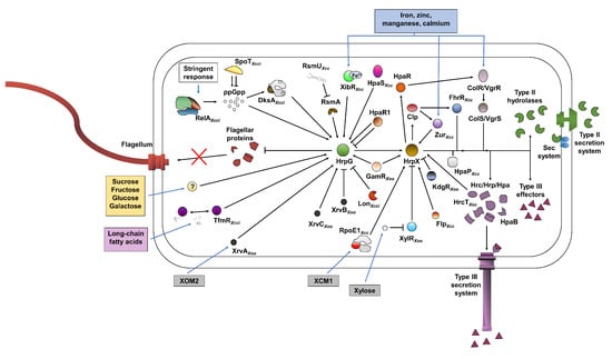 The expression and protein accumulation of HrpG and HrpX are highly dependent on the environment and the metabolic state of the bacterium. The two regulators are strongly expressed upon reaching the plant apoplast [61,62,63,64,65]. By utilizing GFP promoter fusions, Zhang et al. [61] demonstrated that hrpG, hrpX, and T3SS translocator hrpF of Xeu are specifically induced upon entering tomato substomatal cavities, whereas their expression was repressed on the leaf surface.