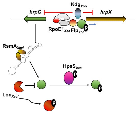 Schematic representation of direct transcriptional and post-transcriptional regulation of HrpG and HrpX. Red “⊣” represents negative transcriptional regulation of hrpG and hrpX based on transcriptional expression and promoter binding analyses. The Blue arrow represents positive transcriptional regulation of hrpX based on transcriptional expression and promoter-binding analyses. Black “⊣” and arrows represent negative and positive post-transcriptional regulation of HrpG, respectively, based on biochemical and functional analyses. Black circled “P” represents protein phosphorylation. Data represent information derived from X. citri subsp. citri (Xcci), X. oryzae pv. oryzae (Xoo), and X. campestris pv. campestris (Xcc).