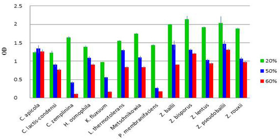 The effect of the sugar concentration on the growth of selected representatives of the species was also tested in artificial must. The optical density of the microplate cultures after five days (119 h 27 min) of incubation is shown in Table S2 and Figure S1. Figure 3 compares the growth of the species. All but one strain grew much better at 20% sugar than at higher sugar concentrations. The exception was C. apicola, which seemed to be slightly osmophilic. Remarkably, in these tests, the C. zemplinina isolates proved highly sensitive to 50 and 60% sugar, and the Zygosaccharomyces isolates grew much better than the strains of the other species at 20% sugar.