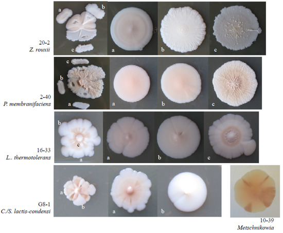 Apart from their morphological diversity (Figure 5), the colonies of certain isolates segregated into sectors which were identical in D1/D2 sequences. Upon inoculation on fresh medium, the sectors usually retained their morphology but were prone to recurrent segregation. This phenomenon was observed among the Z. rouxii, L. thermotolerans, C. lactis-condensi, P. membranifaciens and Metschnikowia isolates.