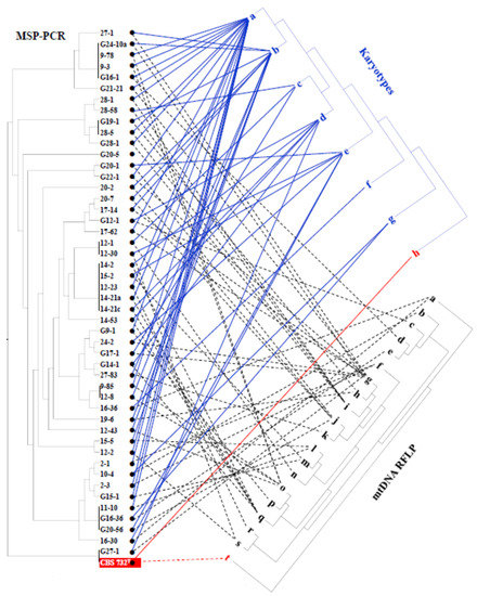 Molecular diversity of the Z. rouxii isolates. Comparison of the positions of the isolates on microsatellite-primed (MSP)-PCR, karyotype, and mtDNA restriction fragment length polymorphism (RFLP) dendrograms.