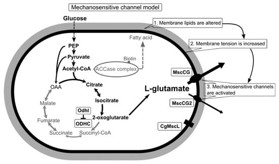 The Corynebacterium glutamicum ATCC13032 strain was first isolated as a glutamate producer in the avian (most likely pigeon) feces-contaminated soil in 1957 by Kinoshita and Udaka [], who described the result of an elaborated screening method with a glutamate-auxotrophic bacterium Leuconostoc mesenteroides strain, P-60 []. This sparked microbial amino acid production and our understanding C. glutamicum physiology has made numerous paradigm shifts in the biotechnological process. Since then, several Corynebacterium glutamicum subspecies, other than the ATCC13032 strain, have been isolated from different materials for industrial production. One of the most striking findings of C. glutamicum studies is biotin-dependent L-glutamate secretion. In nature, glutamate has two optical isomers, d(−) and l(+), and the l form (L-glutamate) is the most widely occurring, while the d form (D-glutamate) occurs rarely in the bacterial cell walls as a component of peptidoglycan layers. At a growth-limiting concentration of biotin, C. glutamicum massively releases L-glutamate into the culture media; however, this bacterium does not produce it at all under normal culture conditions []. Later, several alternative ways to trigger L-glutamate secretion have been reported, and the conditions are surprisingly diversified as impacting the cell wall and membrane, such as the adding of penicillin [], ethambutol [], ciprofloxacin [], fatty acid ester surfactants [], local anesthetics [], and temperature upshift [,]. Correspondingly, a wide range of mechanistic models to explain L-glutamate secretion was suggested, and a coherent model was expected to elucidate the situation. Since L-glutamate is a charged amino acid, passive efflux was rejected, and an active carrier was proposed as the “carrier model” []. The leakage from damaged cell envelopes was considered as one of the main causes due to inhibited fatty acid biosynthesis and membrane alterations in L-glutamate production, proposed as the “leak model” [,,]. Metabolism in the biotin-limited condition was shifted from energy production via tricarboxylic acid (TCA) cycle towards L-glutamate production. Thus, the “metabolic flow change model” was proposed to trigger L-glutamate secretion [,,].