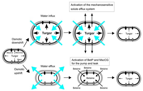The main strategies of C. glutamicum for osmoregulation are mechanosensitive solute efflux systems after an osmotic downshift and the accumulation of compatible solutes, such as betaine, proline, glutamine, ectoine and trehalose, after an osmotic upshift [,,] (Figure 2). An osmotic downshift leads to dramatically increased turgor pressure, due to an excessive water influx. To avoid osmotic cell lysis, C. glutamicum activates, within milliseconds, the mechanosensitive solute efflux system that consists of two types of mechanosensitive channels, MscS-type (MscCG and MscCG2) and MscL-type (CgMscL), to release intracellular solutes swiftly into the environment and reduce the driving force for water entry. The mechanosensitive solute efflux system releases betaine or proline, preferably to other amino acids of similar size, and does not excrete ATP in C. glutamicum []. This is higher substance specificity than the counterpart of the E. coli system that is non-selective and releases even small proteins. After hypoosmotic shock, the cytoplasmic concentration of L-glutamate does not change even after glutamate synthesis after K+ accumulation in a hyperosmotic condition [,]. Thus, it is questionable whether L-glutamate plays an important role as an osmolyte in the osmoregulation in C. glutamicum.