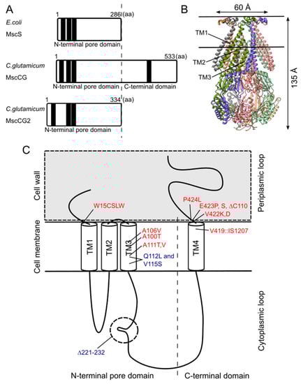 - Becker, M.; Krämer, R. MscCG from Corynebacterium glutamicum: Functional significance of the C-terminal domain. Eur. Biophys. J. 2015, 44, 577–588. [Google Scholar] [CrossRef] [PubMed]