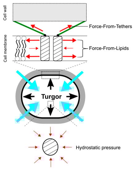 Force-From-Lipids and Force-From-Tethers paradigms for mechanosensing by mechanosensitive channels upon hypoosmotic downshift. Mechanosensitive channels sense transbilayer force profiles in the lipid bilayers and are activated by increased membrane tension. Molecular tethers, such as cytoskeleton and peptidoglycan, also transmit mechanical force to activate mechanosensitive channels (top). In contrast, hydrostatic pressure does not directly activate mechanosensitive channels (bottom). The red, black, and blue, arrows show force to ion channels, turgor pressure, and water influx, respectively.