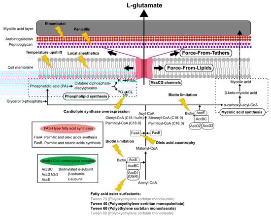 The currently reported specific triggers to induce L-glutamate production can be grouped, such as the inhibition of fatty acid biosynthesis, the alteration of mechanical properties of the cell membrane, and the degradation of the cell wall (Figure 5). The C. glutamicum fatty acid biosynthesis system requires biotin, since the α subunit of acetyl CoA carboxylase complex, AccBC, is biotinylated []. Biotin limitation decreases the catalytic reaction to synthesize malonyl CoA from acetyl CoA and to synthesize α-carboxyl-acyl-CoA from acyl-CoA; thus, the following fatty acid biosynthesis is inhibited as resulting in the alteration of both membranes, the cell membrane and the mycolic acid layer (Figure 5). Other than biotin limitation, the fatty acid ester surfactants, Tween 40 (Polyoxyethylene sorbitan monopalmitate) and Tween 60 (Polyethylene sorbitan monostearate), induce L-glutamate production, but Tween 20 (Polyoxyethylene sorbitan monolaurate) and Tween 80 (Polyoxyethylene sorbitan monooleate) do not. To understand the molecular mechanisms, the dtsR (detergent sensitivity rescuer) gene was isolated as a multicopy suppressor of a Tween 40-sensitive mutation of C. glutamicum that requires fatty acid for growth and secretes L-glutamate without biotin limitation []. DtsR is the β subunits of the acetyl CoA carboxylase complex and renamed later AccD1 since C. glutamicum has four acetyl CoA carboxylase β subunit genes (AccD1–4). AccD1 is involved in the catalytic reaction to synthesize malonyl CoA from acetyl CoA with AccBC (α-subunit) and AccE (ε-subunit), whereas AccD2 and AccD3 are involved in mycolic acid synthesis. Adding Tween 40 decreases the expression level of AccD1, and thus results in the inhibition of fatty acid biosynthesis to induce L-glutamate secretion, as with biotin limitation. From malonyl-CoA, C. glutamicum synthesizes fatty acids with the type-I fatty acid synthesis system, which consists of two types of fatty acid synthase, FasA and FasB []. Unlike other bacteria, C. glutamicum does not have a type-II fatty acid synthesis system. FasA is the main synthase for synthesizing oleoyl-CoA (C18:1) and palmitoyl-CoA (C16:0), and the deletion of FasA is lethal, whereas FasB is the subordinate synthase for saturated stearoyl-CoA (C18:0) and palmitoyl-CoA (C16:0). The fasA mutant requires oleic acids (C18:1) for growth and spontaneously secretes L-glutamate, implying that oleic acid auxotrophy is involved in the activation of MscCG mechanosensitive channels by changing membrane lipids. Furthermore, in fatty acid biosynthesis, C. glutamicum synthesizes phospholipids from phosphatidic acid (PA) for making cell membranes that consist of negatively charged phospholipids: phosphatidylglycerol (PG), cardiolipin (CL), phosphatidylinositol (PI), and phosphatidylinositol mannosides (PIMs). The gene expression for each phospholipid synthesis alters the membrane lipid components. The overexpression of cardiolipin synthase cls causes spontaneous glutamate secretion without any treatment [], implying that the increased amount of cardiolipin in the cell membrane may activate MscCG mechanosensitive channels for glutamate efflux. Cardiolipin is a four-tailed phospholipid, and its structure resembles two phosphatidylglycerols joined via the head groups. Due to its inversed conical shape, cardiolipin is a non-bilayer lipid and contributes to creating membrane curvature, such as the curved poles of rod-shaped bacteria [].
