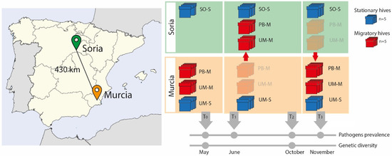 Following a similar research study [35] in this field experiment, ten sentinel hives from the apiary located at the Campus of the University of Murcia (Southeast Spain) were divided into two groups of five hives each. While one group remained stationary (UM-S) during the experiment, the second was moved (UM-M) 430 km to the region of Soria (Northern–Central Spain) during the summer (June–October 2015) (Figure 1). This latter group was moved together with another five hives belonging to a professional beekeeper from Murcia (PB-M) who usually carries out migratory beekeeping. The transported colonies were settled in Soria around 13 km from a stationary apiary of a hobbyist beekeeper (SO-S), thereby sharing the same environmental conditions. Five of these stationary colonies were also sampled. At the beginning of October, the UM-M and PB-M colonies were transported back from Soria to Murcia in the same truck. Thus, samples investigated in the experiment came from four groups of colonies, namely, two from the university campus of Murcia (hives that remained in Murcia, UM-S and those transported to Soria, UM-M), one from the professional beekeeper (hives transported to Soria, PB-M), and that of stationary colonies from Soria (SO-S).