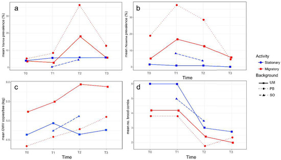 From the 65 pools of RNA extracted from 22 worker honey bees per colony and at the distinct sampling times, DWV was detected in 35 pools (53.9%) with mean viral loads ranging from 2.22 × 104 to 6.89 × 106 DWV copies/bee (Table S1). Due to the random selection of the hives, the initial viral load at T0 differed widely among the colonies irrespective of their management. However, at T1, the average DWV load tended to increase for the migratory and stationary colonies, albeit not significantly (N = 35, p > 0.05). After the migratory period, at T2, there were no clear trends in DWV load between the stationary and migratory colonies (Figure 2c). In general, the largest differences were detected among the individual colonies over the entire study period (T0 to T3), although a temporal fluctuation at the colony level was also observed, irrespective of the management group.