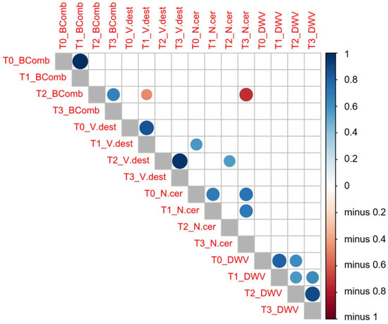 Pearson’s correlation tests between the variables analyzed (V. destructor (V.dest) and N. ceranae (N.cer) infestation rate values, DWV load (DWV) and number of brood combs (BComb)) at each sampling time (T0, T1, T2, and T3). Dark blue means a positive correlation between these two variables, whereas dark red means a negative correlation as indicated in the vertical bar on the right side of the figure.