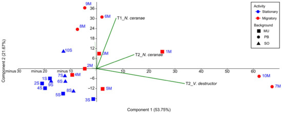 A positive correlation was detected between V. destructor and N. ceranae infestation rates, which is consistent with previous studies showing that weak colonies (less than five brood combs) are more frequently associated with higher numbers of pathogens in adult honey bees [81,82]. Unexpectedly, no correlation was found between V. destructor infestation rate and DWV load, in contrast to many studies that point to varroa as the most important vector for DWV, positively affecting the DWV copy number in honey bees [83]. However, some studies have shown a lag in the correlation [19] between the mite and the virus [84], suggesting that the epidemic’s dynamics are unique to individual colonies or even to different times during the season [85]. As summarized by the PCA analyses, the infection rate of N. ceranae in June (T1) and the infestation rate of V. destructor and N. ceranae in October (T2), appeared to be the variables that most strongly influence the status of migratory and stationary colonies.