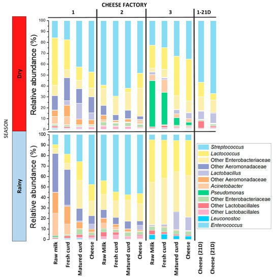 The most representative groups of bacteria, at order level, were those belonging to the Lactobacillales order (58.2% relative abundance in the total assigned sequences), followed by the Enterobacteriales (20.4%), Aeromonadales (10.5%), and Pseudomonadales (7.1%). Curd acidification favored an increase of Lactobacillales, reaching a relative abundance of 69.9% in the dry-season cheese and 63.2% in its rainy counterpart. In turn, bacteria from the Enterobacteriales, Aeromonadales, and Pseudomonadales orders decreased to 17.4%, 7.6%, and 3.4%, respectively, in the dry-season cheese samples, and 26.8%, 5.1%, and 1%, respectively, for cheese in the rainy season, regarding what was found in raw milk of the same samples. Similarly, cold storage modified the relative abundance in the cheese bacterial community, increasing Lactobacillales (82.9%) in dry-season samples after 21 days post-processing, and reducing Enterobacteriales (14.9%), Aeromonadales (0.8%), and Pseudomonales (0.5%). The families of bacteria that had the greatest abundance in Adobera cheese samples were Streptococcaceae (50.5% average in all samples), Enterobacteriaceae (20.4% average), Aeromonadaceae (10.5%), Moraxellaceae (4.1%), Lactobacillaceae (3.7%), and Pseudomonadaceae (3.0%).