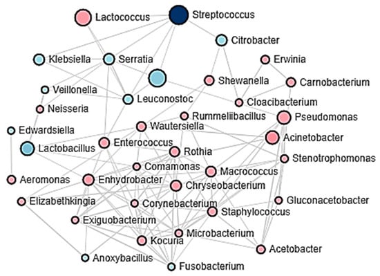 Schematic representation of the interaction among the bacterial genera with the highest abundance in raw milk vs. their persistence in artisanal Adobera cheese based on Pearson’s correlation analysis (p < 0.05, p > 0.3). Each circle represents a different bacterial genus. Larger circles represent correlations of greater magnitude and a greater number of correlations with other bacterial genera. The lines connect each bacterial genus with those it correlates with.