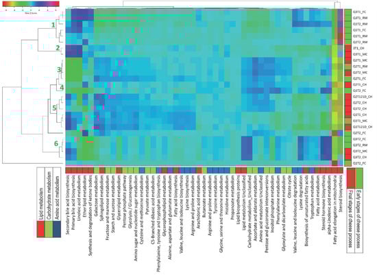 The predicted metabolism profile showed that, at level two of the KEGG functional subcategory, the predicted genes were related to four principal pathways, namely membrane transport, amino-acid metabolism, lipid metabolism, and carbohydrate metabolism. Regarding carbohydrate, lipid and amino-acid metabolism associated with the microbiota composition in the different cheese samples (Figure 4), at least six clusters were distinguished, and major lipid-metabolism-related genes were observed in the early stages of cheese manufacture such as linoleic acid and ether-lipid metabolism, which increased at the final stages of process elaboration, along with others such as secondary bile-acid biosynthesis and some carbohydrate (i.e., galactose and fructose) and amino-acid metabolism and catabolism pathways. However, from the total of predicted genes, only 28 showed statistical differences among samples (p < 0.05), three associated with carbohydrate metabolism (fructose and mannose metabolism, pentose and glucoronate interconversions), two related to amino-acid metabolism (tyrosine and other amino-acid metabolism) and two more to lipid metabolism (glycerolipid metabolism and primary bile-acid biosynthesis). The remaining significant metabolic pathways were mainly related to transporters, phosphotransferase system (PTS), carbon fixation in photosynthetic organisms, sulfur metabolism, biosynthesis of ansamycins, betalain biosynthesis and RNA degradation, among others. It was interesting to find predicted genes involved in xenobiotics biodegradation and metabolism (specifically to DDT degradation), mainly in raw-milk samples.