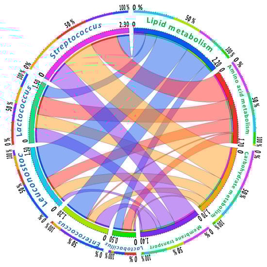 Schematic representation of Pearson’s correlations among relative abundance of main genera of core bacteria and relative frequencies of KEGG predicted genes associated with metabolic pathways at level two in artisanal Adobera cheese samples. Stronger correlation scores are represented by thicker bonds (Created with: Circos Table Viewer v0.63-9).
