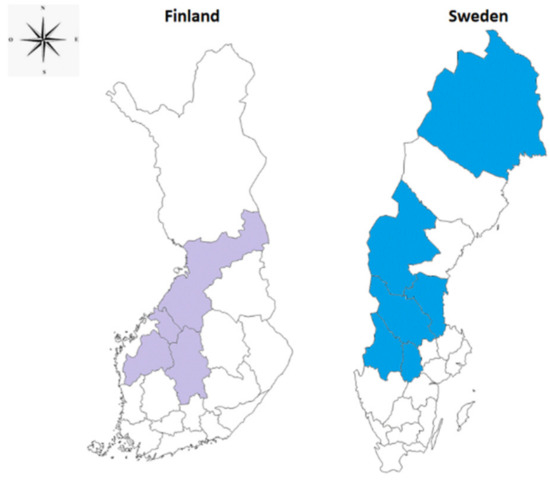 Tularemia high-risk areas in Finland highlighted with purple color and in Sweden highlighted with blue color [54,57].