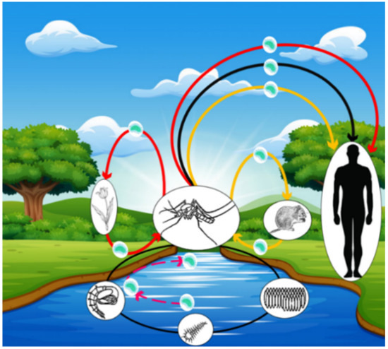 Mosquitoes are known to be vectors of many pathogens, including viruses and parasites (Table 1). Malaria caused by different species of the complex Plasmodium and transmitted by Anopheles mosquito species caused 584,000 deaths in 2013 around the world in 97 countries. Malaria is considered the most virulent human protozoan disease [27,39]. Moreover, viruses are the most dangerous pathogens transmitted by mosquitoes [40]. Mosquitoes’ capacity to transmit bacteria was unknown prior to detecting the species Rickettsia felis in Cx. quinquefasciatus and the bacteria Fth in several mosquito species [41,42]. Besides, Bacillus anthracis has been transmitted experimentally (mechanical transmission) by Ae. aegypti and Ae. taeniorhynchus mosquito species [43]. However, the mode of transmission of bacteria from the mosquito vector to hosts remains unclear.