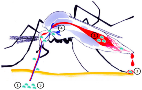 The blood meal necessary for mosquito eggs embryogenesis is obtained by biting humans or animals. During blood meals, females inject a mixture of saliva into their hosts to facilitate their meal. They may also inject pathogens into the host blood capillaries. These pathogens are acquired by the mosquito during previous blood meals and are present in the proboscis (i.e., the elongated appendage from the head) or salivary glands of these arthropods [30].