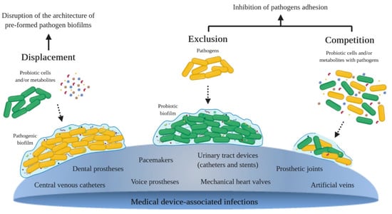 Novel technologies to prevent biofilm formation on medical devices, such as bactericidal coatings and adhesion-resistant surfaces, are being developed [8,25]. The increasing evidence of the effect of probiotics on the prevention and treatment of device-associated biofilms, and an increasing interest in promoting natural approaches to health have intensified the research in the field of probiotics and their metabolites to battle pathogenic biofilms [1,14,26,27,28,29]. Probiotics are defined as non-pathogenic live microorganisms (bacteria or yeasts) that, when administered in appropriate amounts, produce health benefits on the host. They have been used in clinical practice, mainly to restore the balance of the gastrointestinal tract [30,31,32,33]. Probiotics have received substantial attention regarding their health-promoting properties, possessing the status of Generally Regarded as Safe (GRAS) [34,35]. The most commonly used probiotics are species of lactic acid bacteria (LAB), which include Lactobacillus, Bifidobacterium, Streptococcus, Lactococcus and Leuconostoc [35,36,37]. Probiotics may act by displacement, exclusion and competition with pathogenic bacteria (Figure 1). The displacement strategy consists in the disruption of the architecture of pre-formed pathogen biofilms through the addition of probiotics and/or their metabolites; exclusion consists in pre-coating a surface with probiotics and/or their metabolites in order to inhibit pathogen adhesion; and competition consists in the co-culture of probiotics and/or their metabolites and pathogenic cells [34,38,39,40,41,42]. The main antimicrobial substances produced by probiotic cells are organic acids (lactic, acetic, propionic and succinic acid), hydrogen sulfide and peroxide, ethanol, carbon dioxide, EPS, biosurfactants and bacteriocins [34,35,38,39,41,43,44,45,46,47,48].