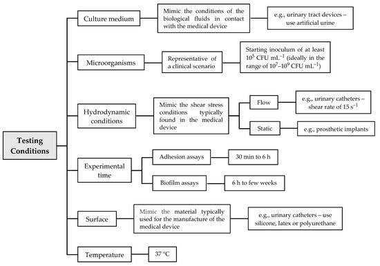 Based on the MINORS scale (Table 4), some optimal testing conditions should be taken into consideration in future studies, which may help to systematize the results (Figure 3). Those conditions will always depend on the medical device in hand and the environment where it is inserted. The nutritional conditions (i.e., the culture medium) should mimic the biological fluids with which the device will be in contact when placed on the patient. For example, for tests of urinary tract devices, artificial urine medium is recommended [13]. Additionally, the experiments should start with an exponential phase culture, and the concentration of the starting inoculum should be of at least 105 CFU mL−1 (ideally in the range of 107–109 CFU mL−1) in order to obtain the minimum required 3–4 Log reduction of viability or growth typical of standard tests of microbial activity [13]. Since flow conditions may affect cell adherence and biofilm formation—and, subsequently, the action of antibiofilm substances [13]—the hydrodynamic conditions used in the in vitro experiments should simulate those typically found in the target device. For instance, static conditions should be chosen when evaluating new antibiofilm approaches for prosthetic implants, whereas dynamic conditions are ideal to mimic the flow in urinary tract devices (shear rate of 15 s−1 [101]) and central venous catheters. Regarding the biofilm formation period, it should also be adapted to the specific biomedical scenario. Urinary catheters usually remain inserted in the patient for more than one day, and thus the experimental time should not be less than 24 h, which is the referenced time for biofilm maturation in urinary catheters [129]. For adhesion assays, it is reasonable to use periods from 30 min to 6 h, and for biofilm assays, from 6 h to weeks. For long-term exposures, we recommend the use of discrete periods (e.g., 24 h, 48 h or 72 h). Concerning the surface material, assays should be performed using a material currently used for the manufacture of these devices. For example, to mimic urinary catheters, silicone, latex, polyurethane and PDMS can be used, while for dental prostheses, saliva-coated titanium or hydroxyapatite discs are more indicated. Regardless of the biomedical application, the temperature of incubation should be 37 °C, because it is the average temperature of the human body.