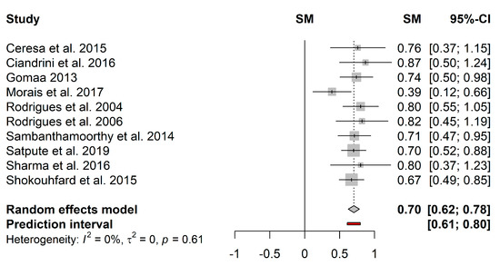 The pooled effect estimates and respective 95% confidence interval were calculated for the four antibiofilm substances. Figure 4 represents the forest plot of the pooled effect estimates for the proportion of biofilm reduction induced by biosurfactants. Heterogeneity in the mean proportion of biofilm reduction was not observed among the 10 included studies (I2 = 0%; τ2 = 0; p = 0.61). The pooled results showed a mean proportion (95%–CI) of 70% (62%–78%) and a predictive interval of 61%–80%.