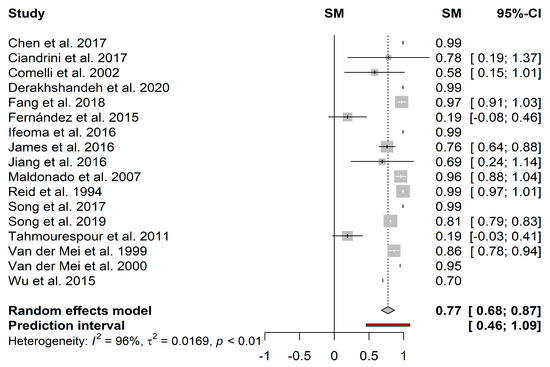 In turn, the heterogeneity in the mean proportion of biofilm reduction induced by cells (Figure 5) among the 17 included studies was statistically significant (I2 = 96%; τ2 = 0.0169; p < 0.01). This heterogeneity can be justified by the great variability in the growth conditions among the selected studies. For example, Stepanović et al. [130,131] showed that the biofilm formation of some microorganisms was remarkably reduced under dynamic conditions. Since most of the studies did not indicate shear stress or shear rate values, it was not possible to fully compare the effectiveness of the different substances. The heterogeneity can be justified by the test of different species of probiotics, whose amount and diversity of metabolites may vary according to the species. The pooled results showed a mean proportion (95%–CI) of 77% (68%–87%) and a predictive interval of 46%–100% for probiotic cells.