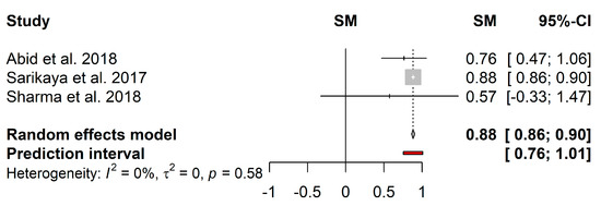 Regarding the biofilm reduction induced by EPS, only 3 studies were included in the meta-analysis (Figure 6). Although the heterogeneity in the mean proportion was not statistically significant (I2 = 0%; τ2 = 0; p = 0.58), these could have been caused by the reduced number of included studies. The pooled results showed a mean proportion (95%–CI) of 88% (86%–90%) and a predictive interval of 76%–100%.