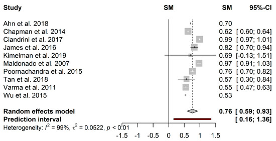 - Higgins, J.P.T.; Thompson, S.G.; Deeks, J.J.; Altman, D.G. Measuring inconsistency in meta-analyses. BMJ 2003, 327, 557–560. [Google Scholar] [CrossRef]