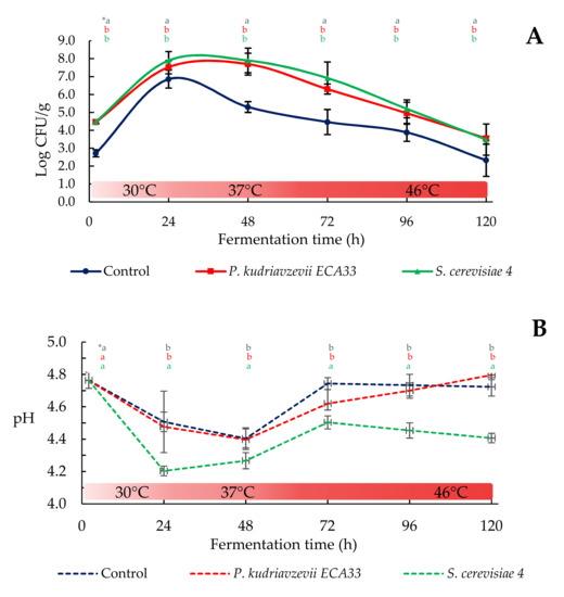 (A): Growth dynamics of the total yeasts during the simulated fermentation of re-hydrated cocoa beans. Batch inoculated with P. kudriavzevii ECA33 (red line), batch inoculated with S. cerevisiae 4 (green line) and uninoculated control batch (blue line). (B): pH variation during the simulated fermentation of re-hydrated cocoa beans. Batch inoculated with P. kudriavzevii ECA33 (red dashed line), batch inoculated with S. cerevisiae 4 (green dashed line) and uninoculated control batch (blue dashed line). * Different letters in the same column (hour) indicate significant differences (p < 0.05) among inoculated strains; first row Control, second row P. kudriavzevii ECA33, and third row S. cerevisiae 4.